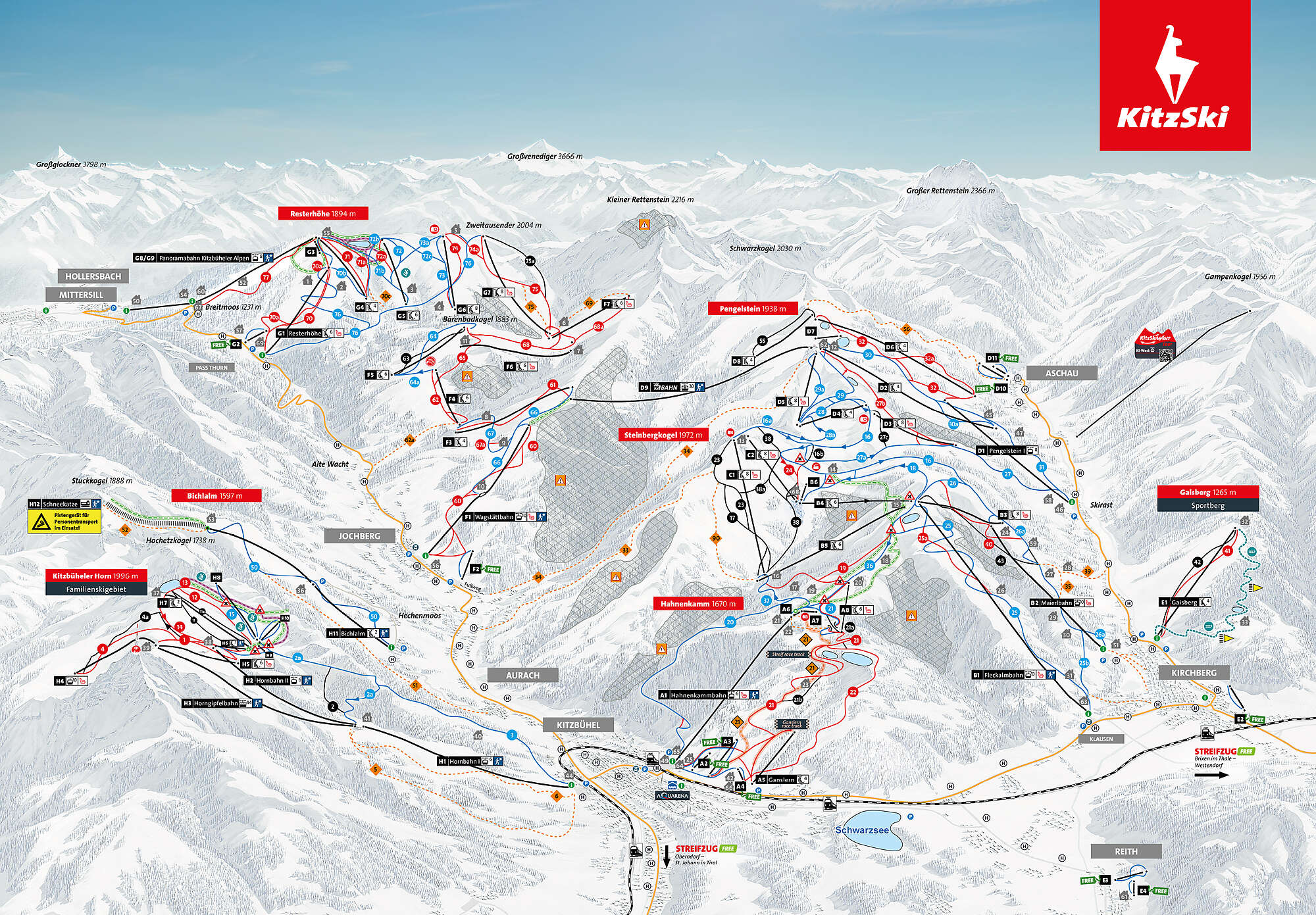 KitzSki is made up of two main ski areas. The larger one is Kitzbühel Kirchberg, and the slightly smaller one is Jochberg Mittersill. There is also the Kitzbüheler Horn section with 17 km of slopes but it is only accessible by ski bus. There are also a couple unconnected lifts around Kirchberg. Because these areas are not fully linked by pistes or lifts, we chose not to visit them. The lack of full connectivity is inconvenient, especially if you prefer to avoid ski buses. That said, the two main areas offer plenty of skiing, so this was not a deal breaker.
