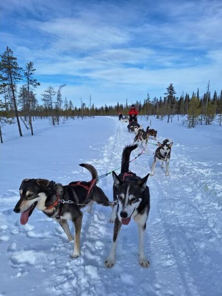 One of the most iconic experiences in Lapland is a husky sled ride. You’ll be pulled through snowy landscapes by a team of enthusiastic huskies—it’s as magical as it sounds. Usually, you can also visit the kennel, learn about its operations, and pet the dogs. For an ethical experience, choose a provider that treats the animals well. Husky safaris vary in length; a short 1-2 km ride can give you a taste of the experience if you’re on a budget, but a longer 10-20 km tour allows to enjoy the ride for longer. Although the cost can be high, reflecting the expense of feeding and training the dogs year-round, a husky safari is an unforgettable and essential part of any Lapland visit.